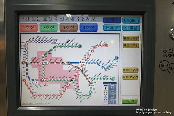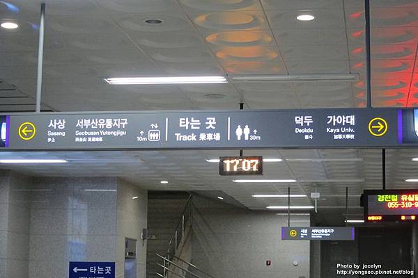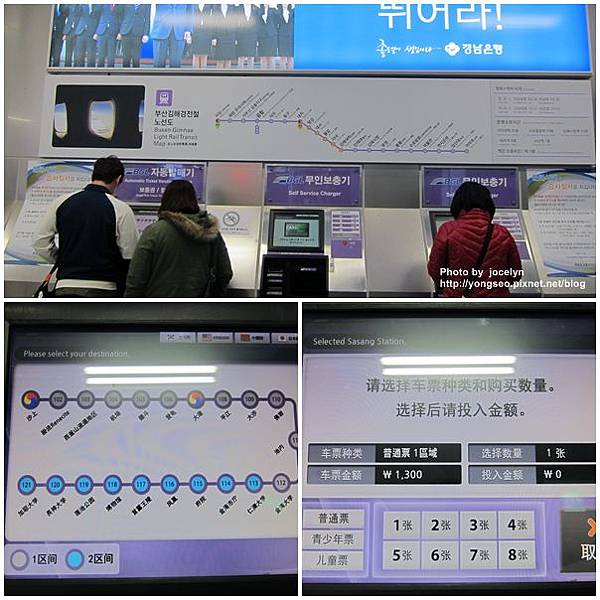 現在釜山金海機場在輕軌這邊可以直接儲值T-MONY,沒有T-MONY卡的話,就直接買單程票到沙上(空港→沙上的票價為1300韓幣)然後轉2號線到西面站(沙上→西面的票價為1200韓幣)不會韓文也沒關係,因為它有中文介面,揪甘心^^